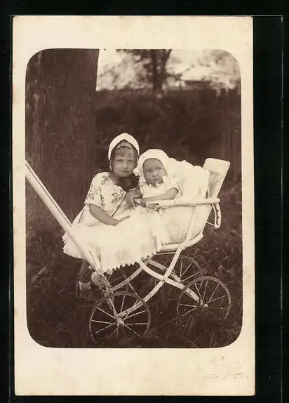 AK Kleines Mädchen neben ihr Geschwisterchen im Kinderwagen