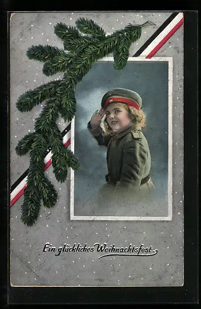 AK Kleines Mädchen salutiert in Uniform, Weihnachtskarte