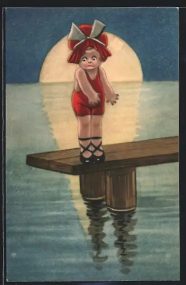 AK Kleines Mädchen springt bei Mondesschein in das Meer