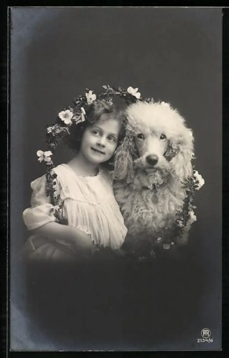 AK Kleines Mädchen und Pudel im Blumenkranz