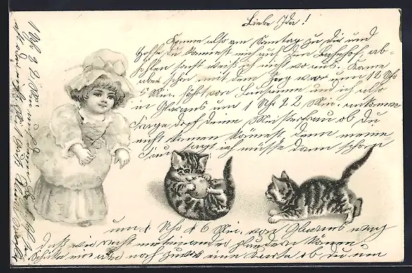 AK Kleines Mädchen und zwei verspielte Kätzchen mit Ball