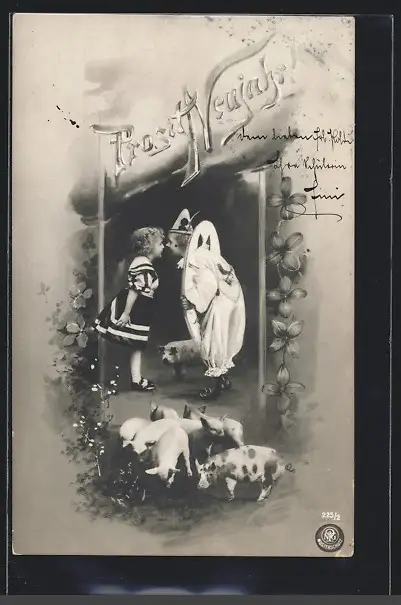 AK Kleines Paar in Faschingskostümen mit Schweinchen, Neujahrsgruss
