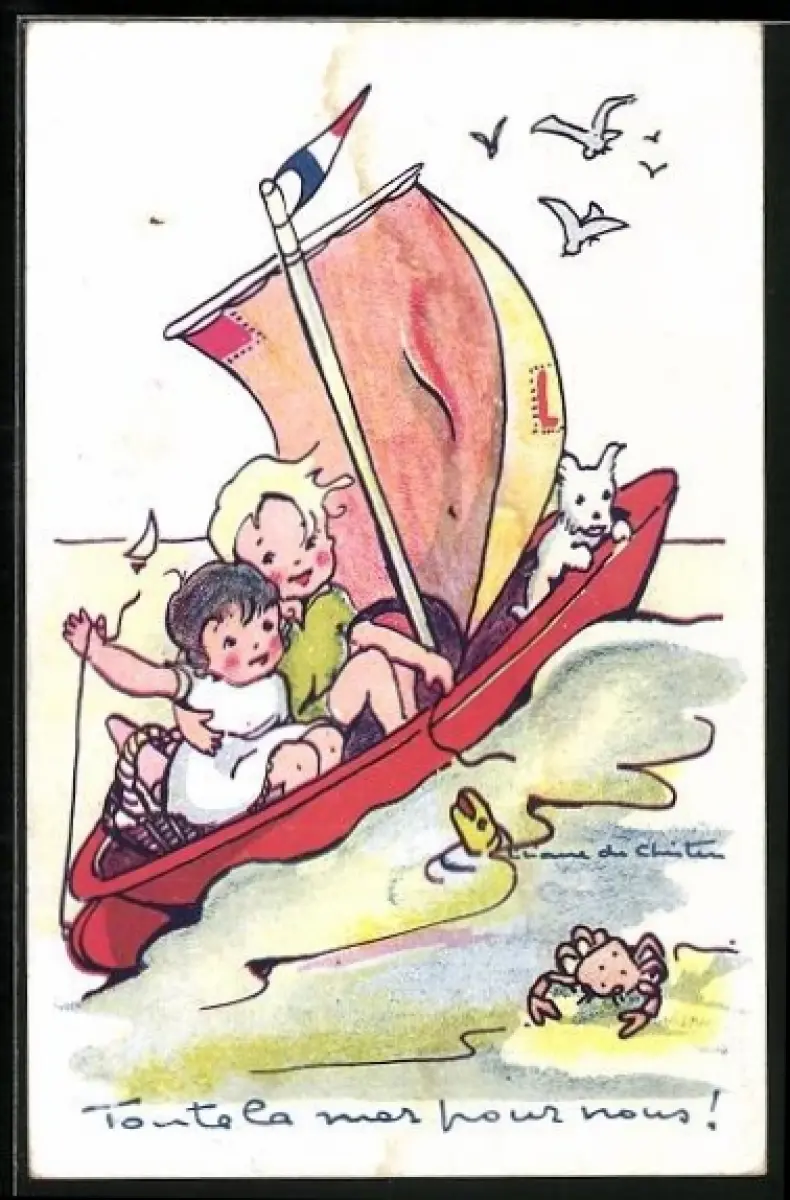 AK Kleines Paar mit Hund im Segelboot auf dem Meer