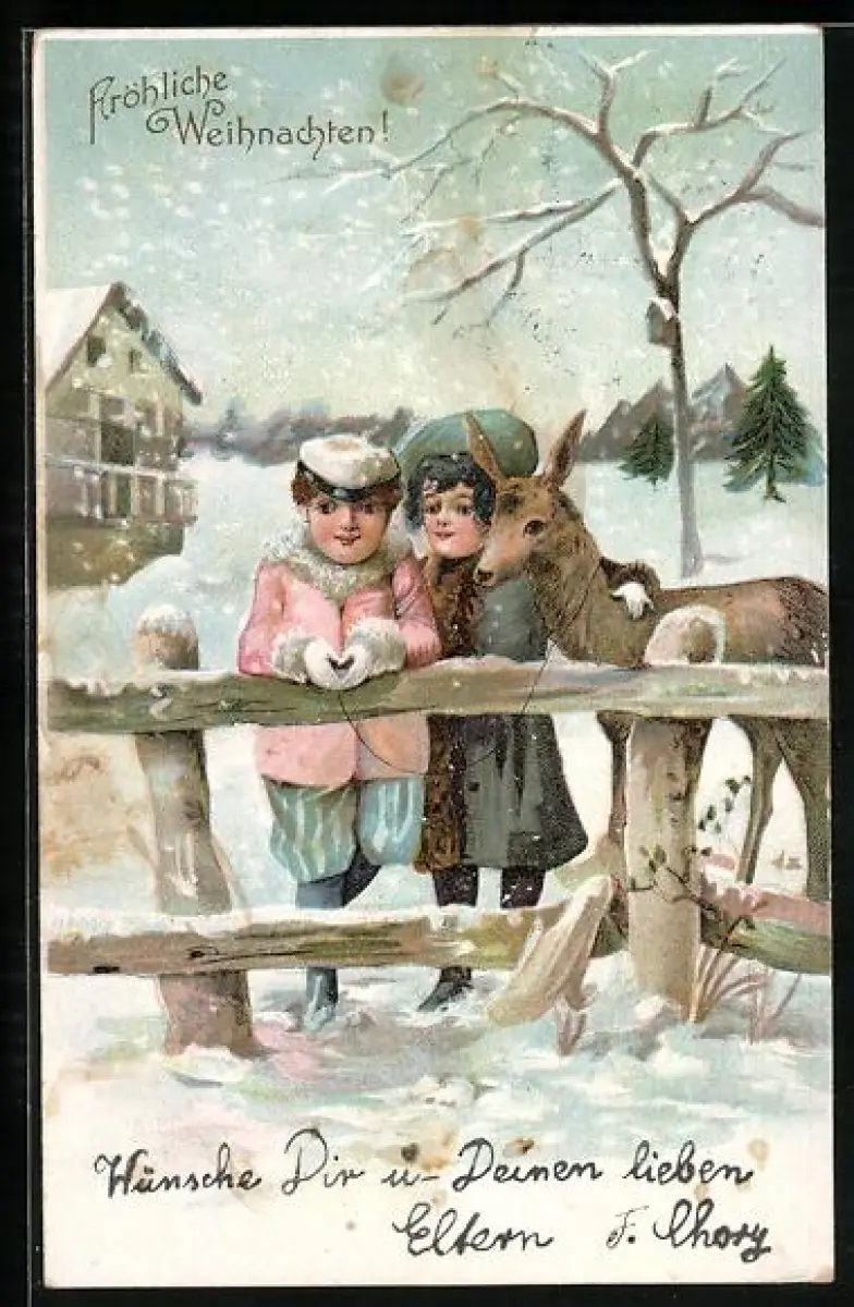 AK Kleines Paar mit Reh im Winter, Weihnachtsgruss