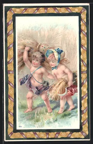 AK Kleines nacktes Pärchen mit Getreide auf dem Arm
