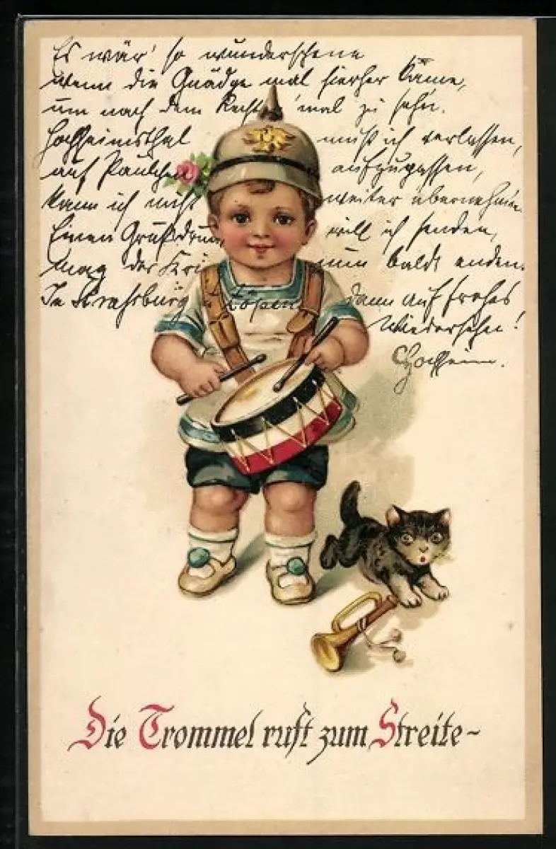 AK Kleinkind in Pickelhaube mit Trommel, Die Trommel ruft zum Streite