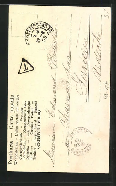 Personenbezogene Daten auf der Rückseite der Karte wurden durch blauen Textmarker unkenntlich gemacht. Die blauen Stellen sind auf die Vorderseite durchgeweicht und wirken sich negativ auf das Postkartenfoto aus