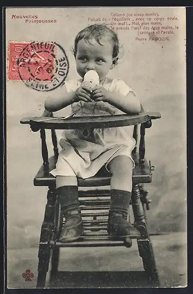 AK Kleinkind mit einem Frühstücksei auf einem Kinderstuhl