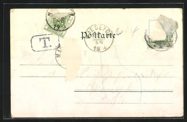 alte Ansichtskarte, gelaufen 1904, Briefmarke tw. entfernt, rückseitig Oberflächenschaden, Eckknick li. oben, Stempelspur, guter Zustand