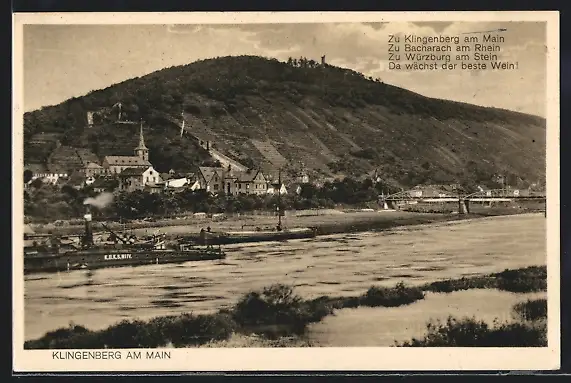 AK Klingenberg am Main, Uferpartie mit Kirche und Fähre K. B. K. S. No. 5