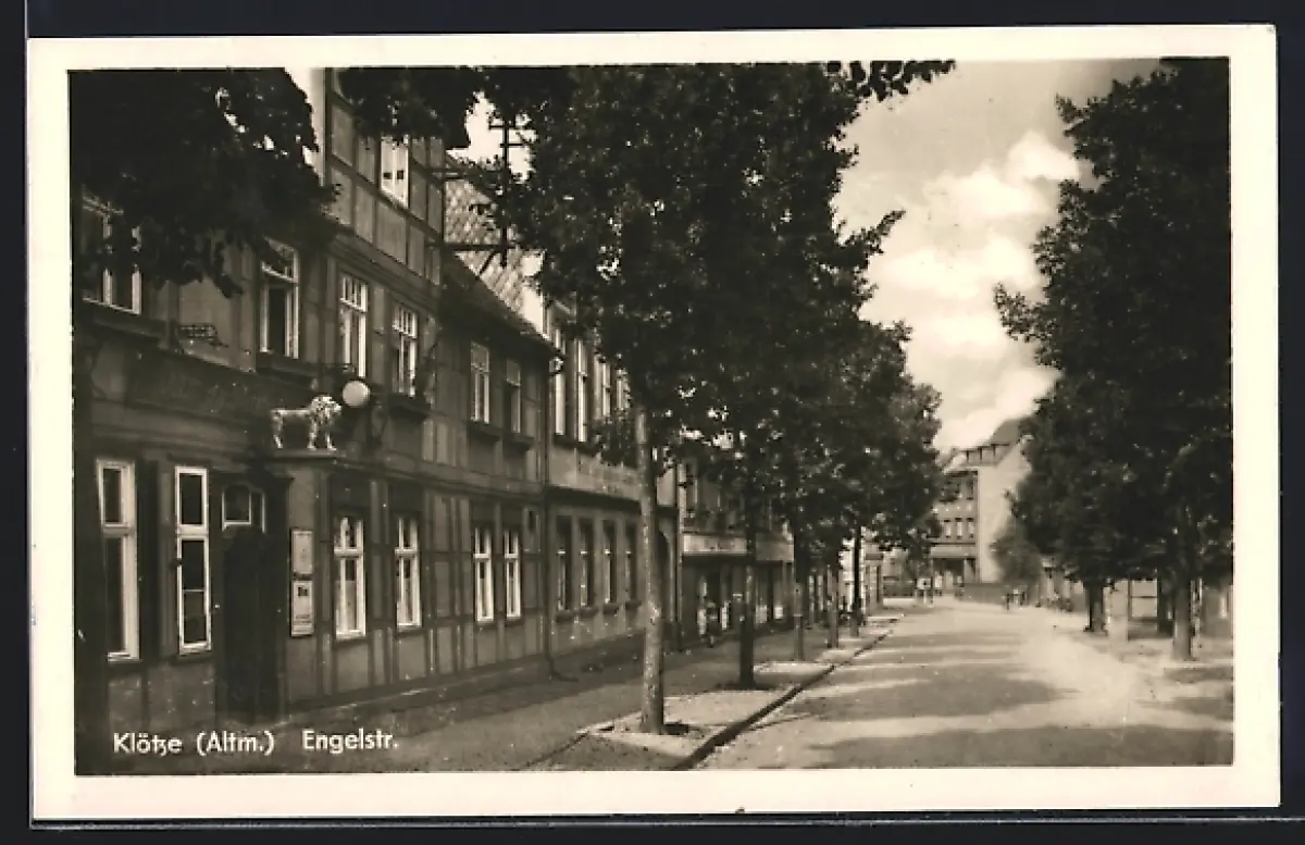 AK Klötze /Altm., Blick in die Engelstrasse mit Gasthaus Zum goldenen Löwen und Hotel Zum goldenen Löwen