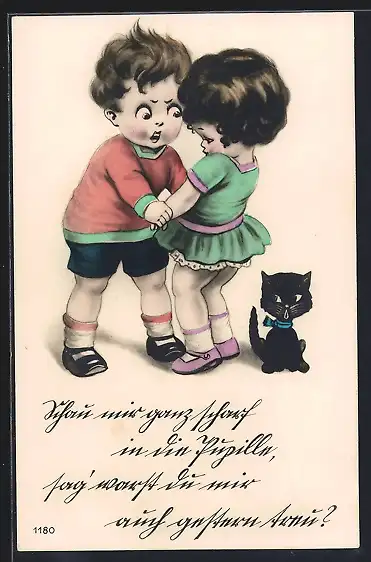 AK Knabe ist wütend auf ein Mädchen, daneben eine erschrockene Katze