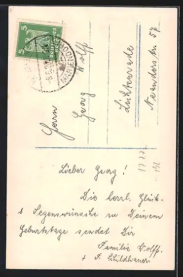 Personenbezogene Daten auf der Rückseite der Karte wurden durch blauen Textmarker unkenntlich gemacht. Die blauen Stellen sind auf die Vorderseite durchgeweicht und wirken sich negativ auf das Postkartenfoto aus
