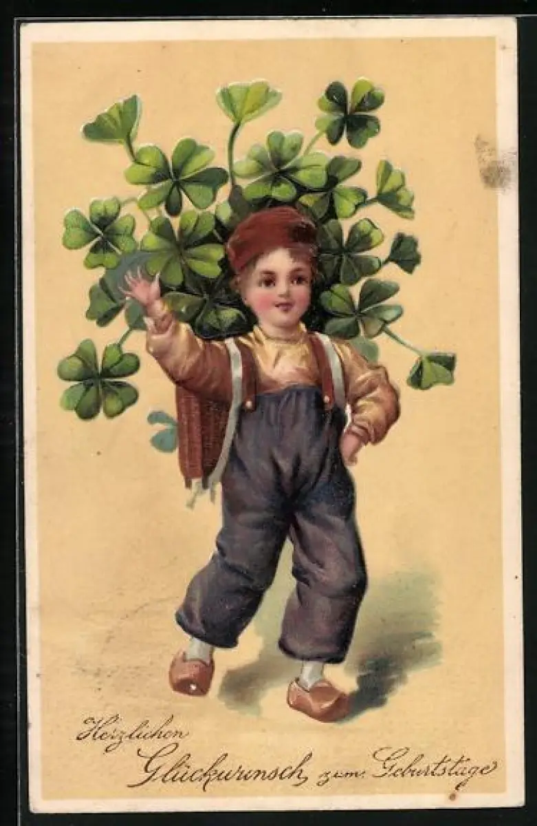 AK Knabe mit Klee in einem Korb, Herzlichen Glückwunsch zum Geburtstag