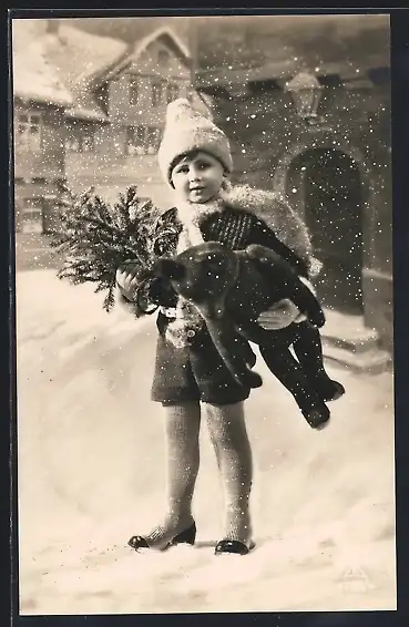 AK Knabe mit Teddybär und Tannenbäumchen auf einer verschneiten Strasse