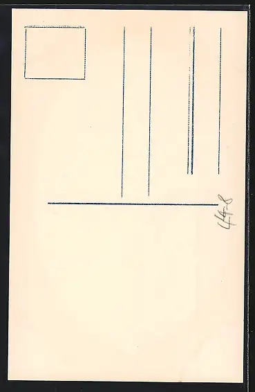 Personenbezogene Daten auf der Rückseite der Karte wurden durch blauen Textmarker unkenntlich gemacht. Die blauen Stellen sind auf die Vorderseite durchgeweicht und wirken sich negativ auf das Postkartenfoto aus