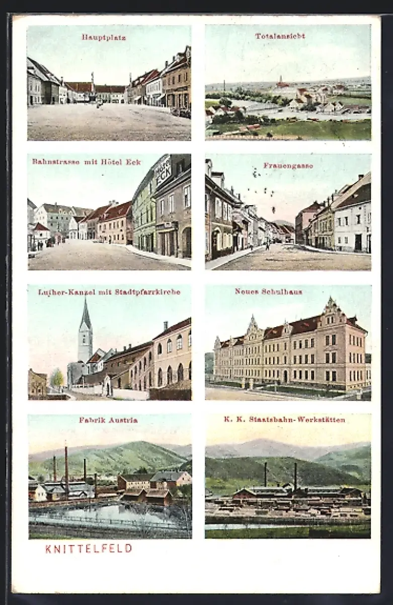 AK Knittelfeld, Bahnstrasse mit Hotel Eck, Frauengasse und K. K. Staatsbahn-Werkstätten