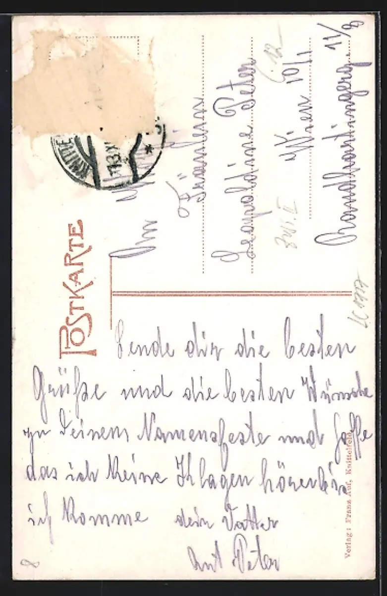 alte Ansichtskarte, gelaufen, Briefmarke entfernt, rückseitig Oberflächenschaden, Eckknick re. oben, Bugspuren re. oben, guter Zustand