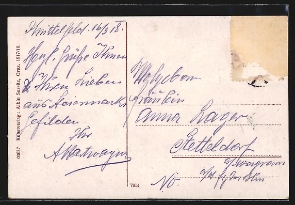 alte Ansichtskarte, gelaufen 1918, Briefmarke entfernt, rückseitig Oberflächenschaden, guter Zustand
