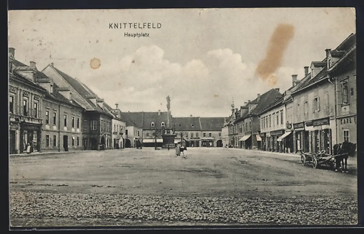 AK Knittelfeld, Hauptplatz mit Geschäften und Denkmal