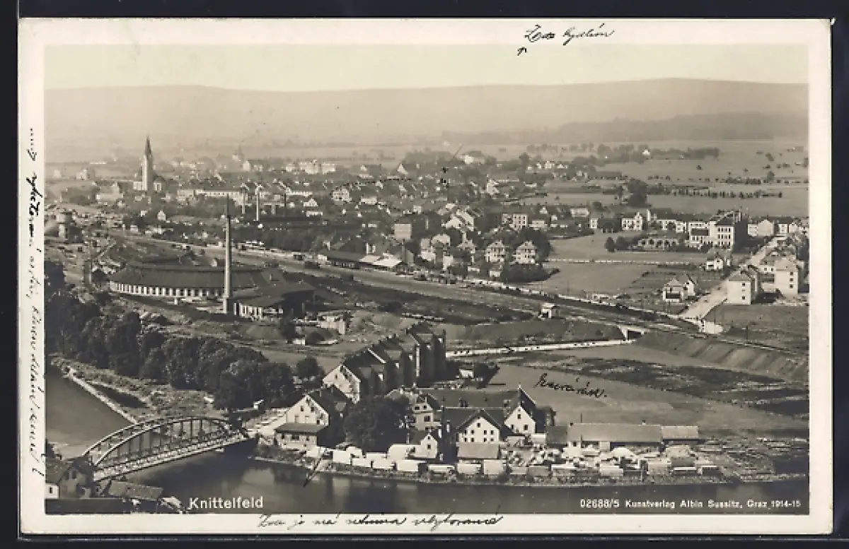 AK Knittelfeld, Ortsansicht mit Gleisanlagen und Brücke aus der Vogelschau