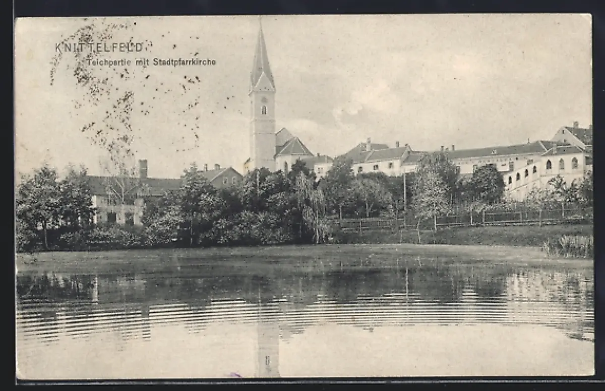 AK Knittelfeld, Stadtpfarrkirche vom Teich aus gesehen