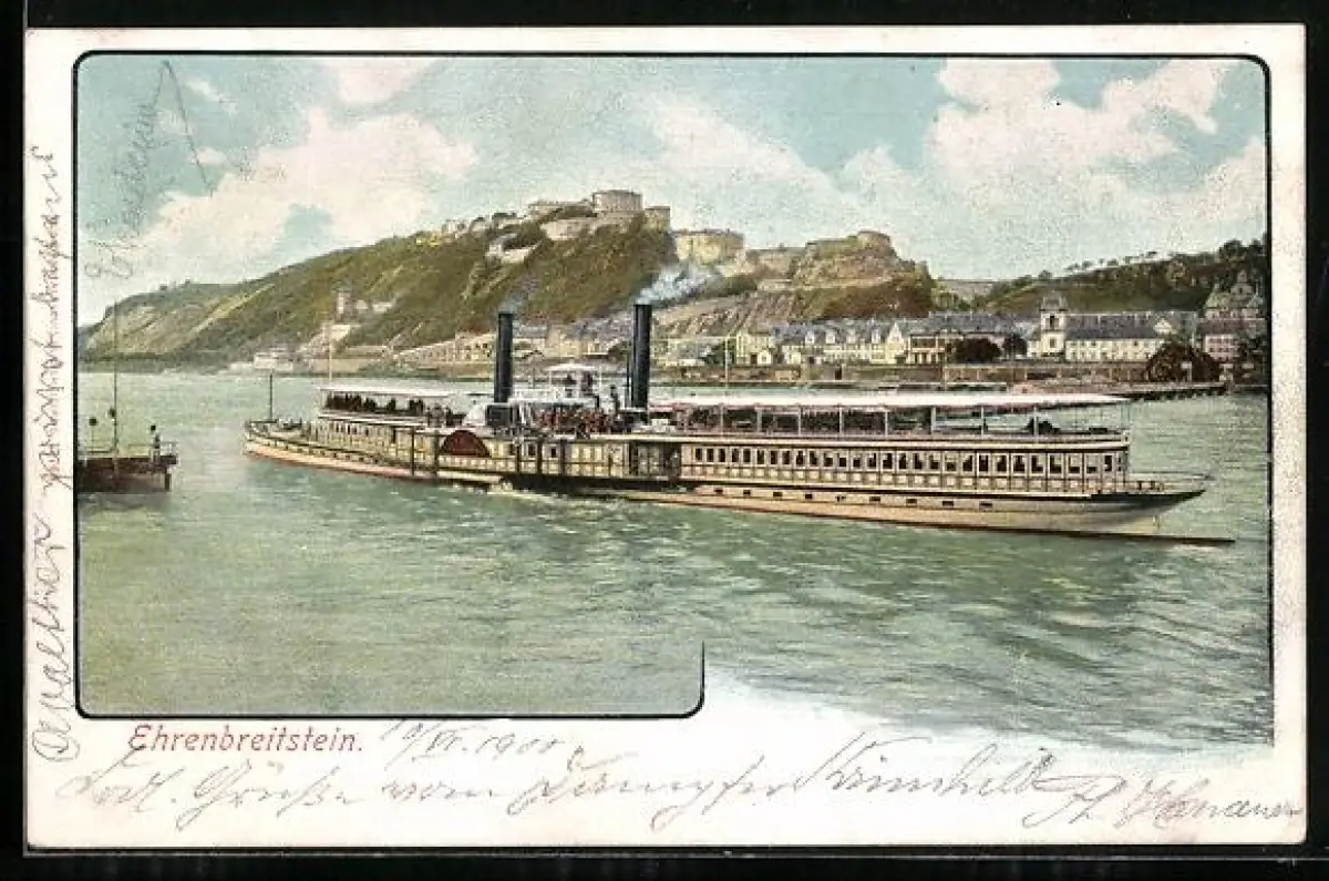 AK Koblenz, Festung Ehrenbreitstein, Dampfer auf dem Rhein