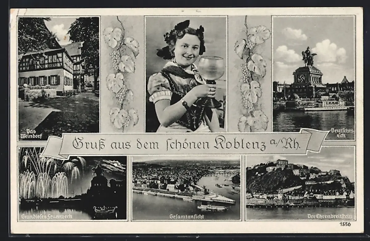 AK Koblenz a. Rh., Deutsches Eck, Das Weindorf, Ehrenbreitstein, Frau mit Weinglas