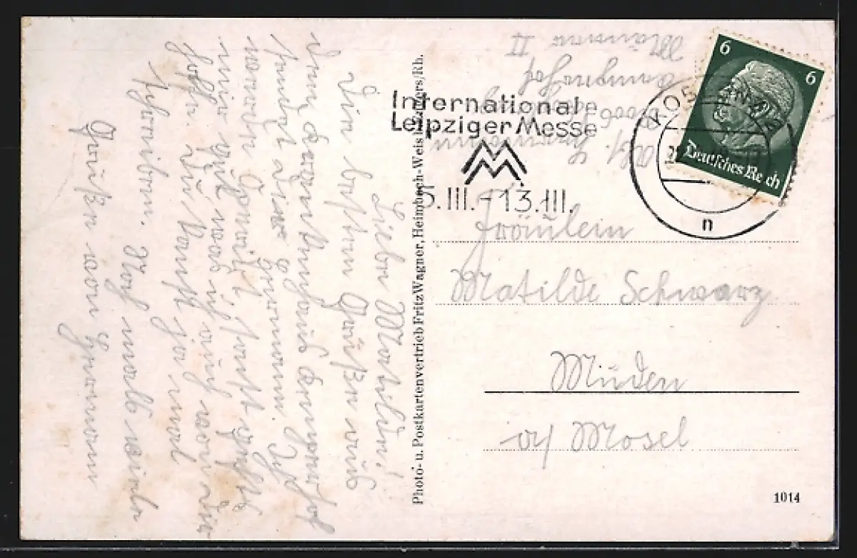 Personenbezogene Daten auf der Rückseite der Karte wurden durch blauen Textmarker unkenntlich gemacht. Die blauen Stellen sind auf die Vorderseite durchgeweicht und wirken sich negativ auf das Postkartenfoto aus