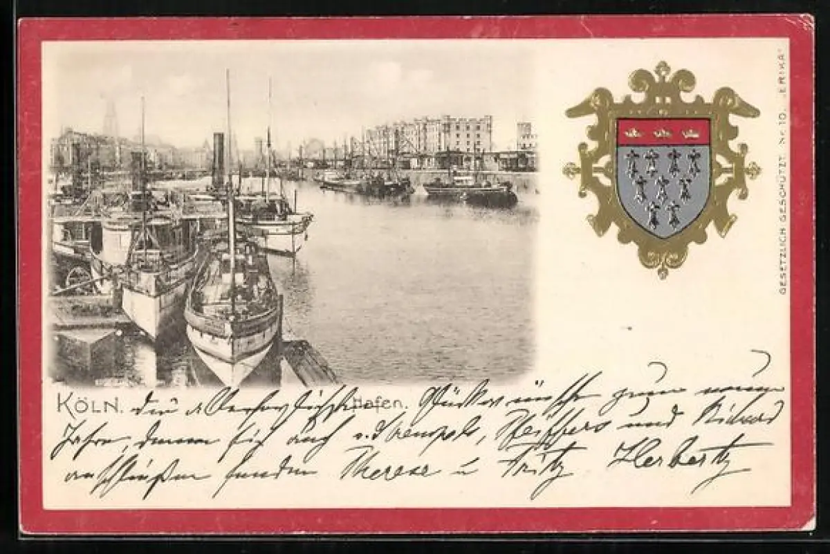 AK Köln, Binnenhafen mit Raddampfern, Wappen von Köln