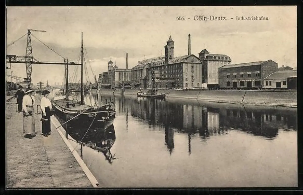 AK Köln-Deutz, Industriehafen, Lastkahn, Spaziergänger