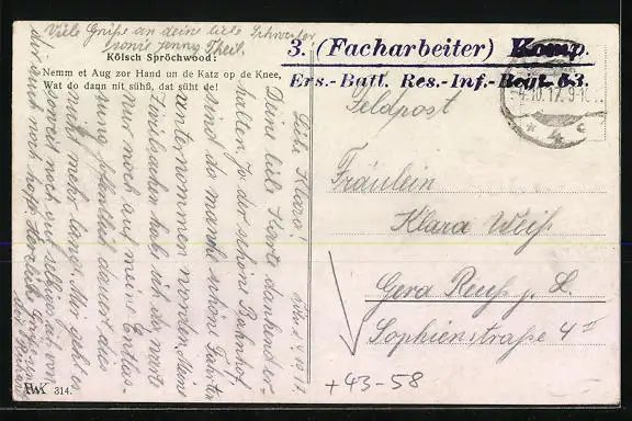 alte Ansichtskarte, gelaufen 1917, Durchbruch li. oben, guter Zustand