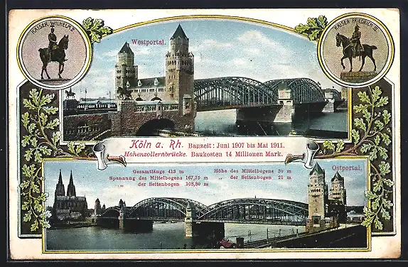AK Köln-Neustadt, Rheinbrücke mit Kaiser Wilhelm II. u. Kaiser Friedrich III.