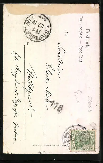 Personenbezogene Daten auf der Rückseite der Karte wurden durch blauen Textmarker unkenntlich gemacht. Die blauen Stellen sind auf die Vorderseite durchgeweicht und wirken sich negativ auf das Postkartenfoto aus