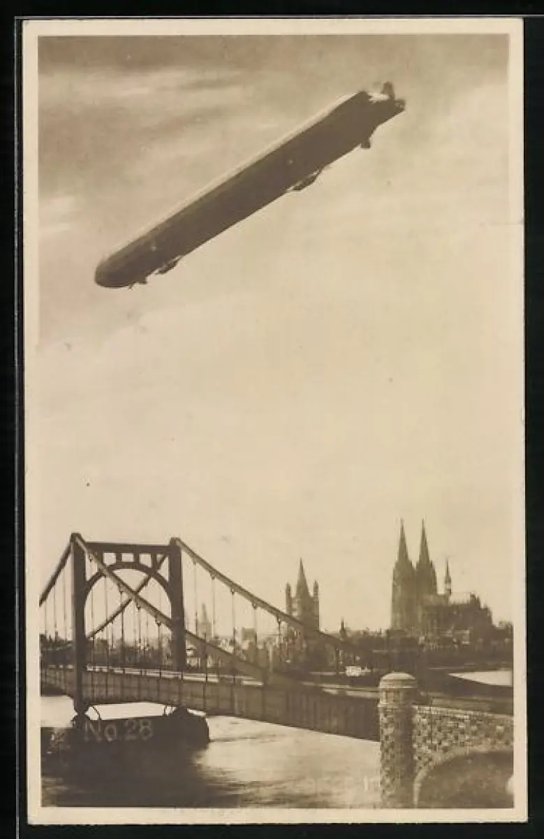 AK Köln, Zeppelin über Rheinpartie mit Brücke