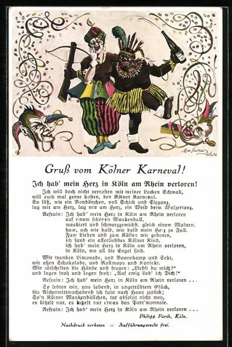 AK Köln, Zwei Personen in Kostümen, Liedtext Ich hab mein Herz in Köln am Rhein verloren