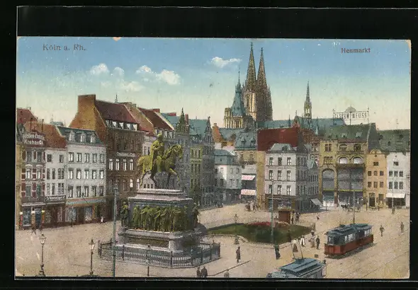 AK Köln a. Rh., Heumarkt mit Pfeifen-Fabrik Krahn & Co, Denkmal und Strassenbahn