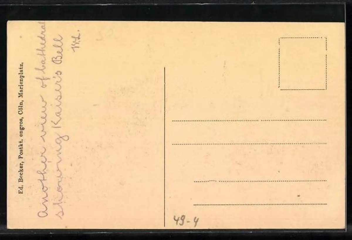 Personenbezogene Daten auf der Rückseite der Karte wurden durch blauen Textmarker unkenntlich gemacht. Die blauen Stellen sind auf die Vorderseite durchgeweicht und wirken sich negativ auf das Postkartenfoto aus
