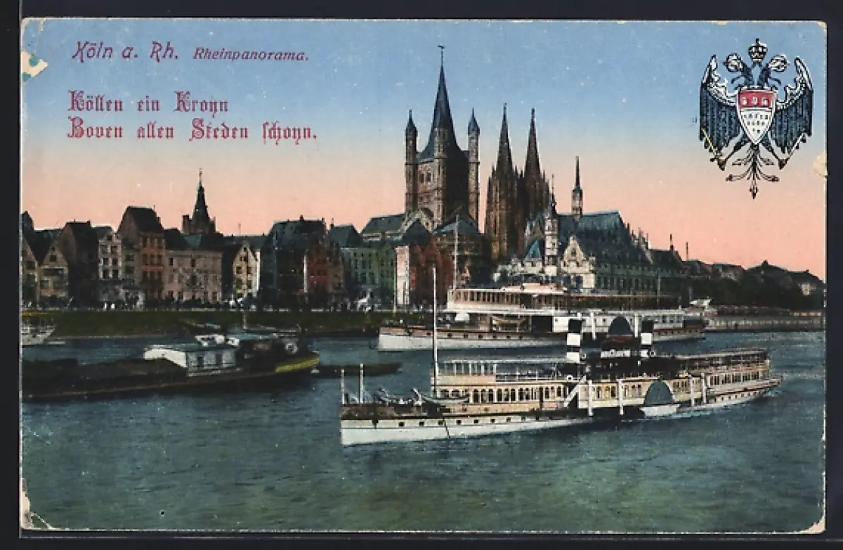AK Köln a. Rh., Rheinpanorama, Dom, Dampfschiffe