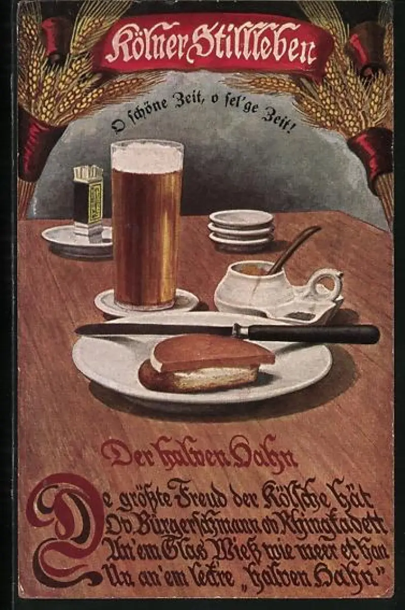 AK Kölner Eigenarten, Halver Hahn, Roggenbrötchen mit Käse, Bierglas