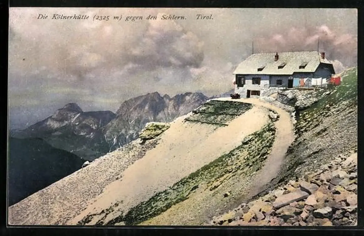 AK Kölnerhütte der Sektion Rheinland, Panorama mit Rosengarten-Dolomiten gegen den Schlern