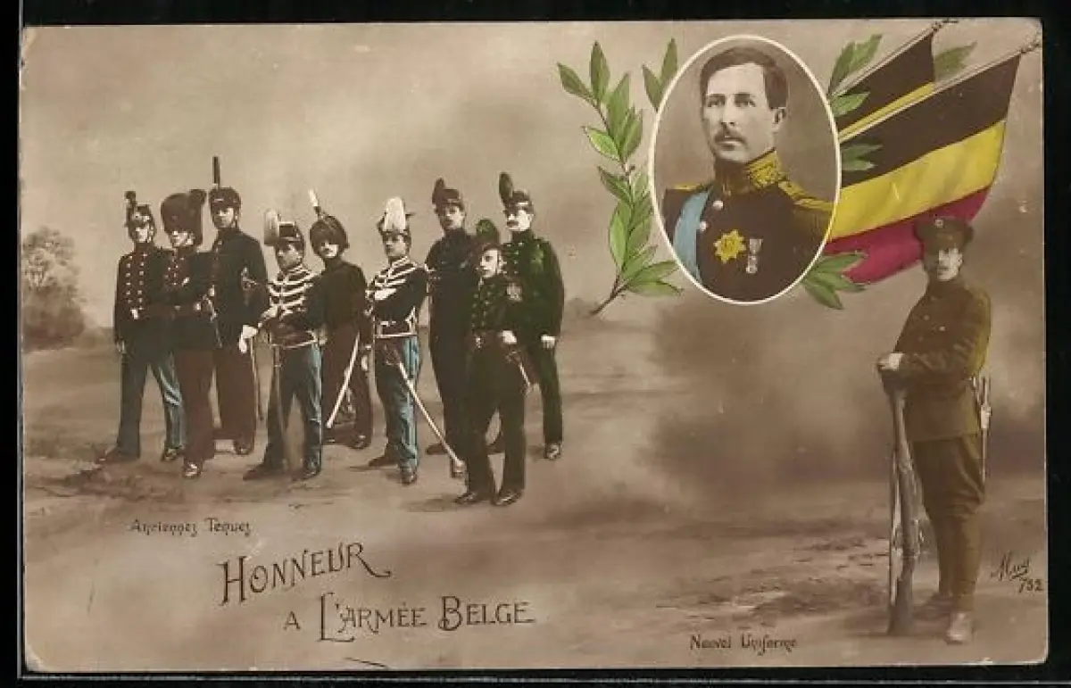AK König Albert von Belgien mit Flaggen, Soldaten in Uniform
