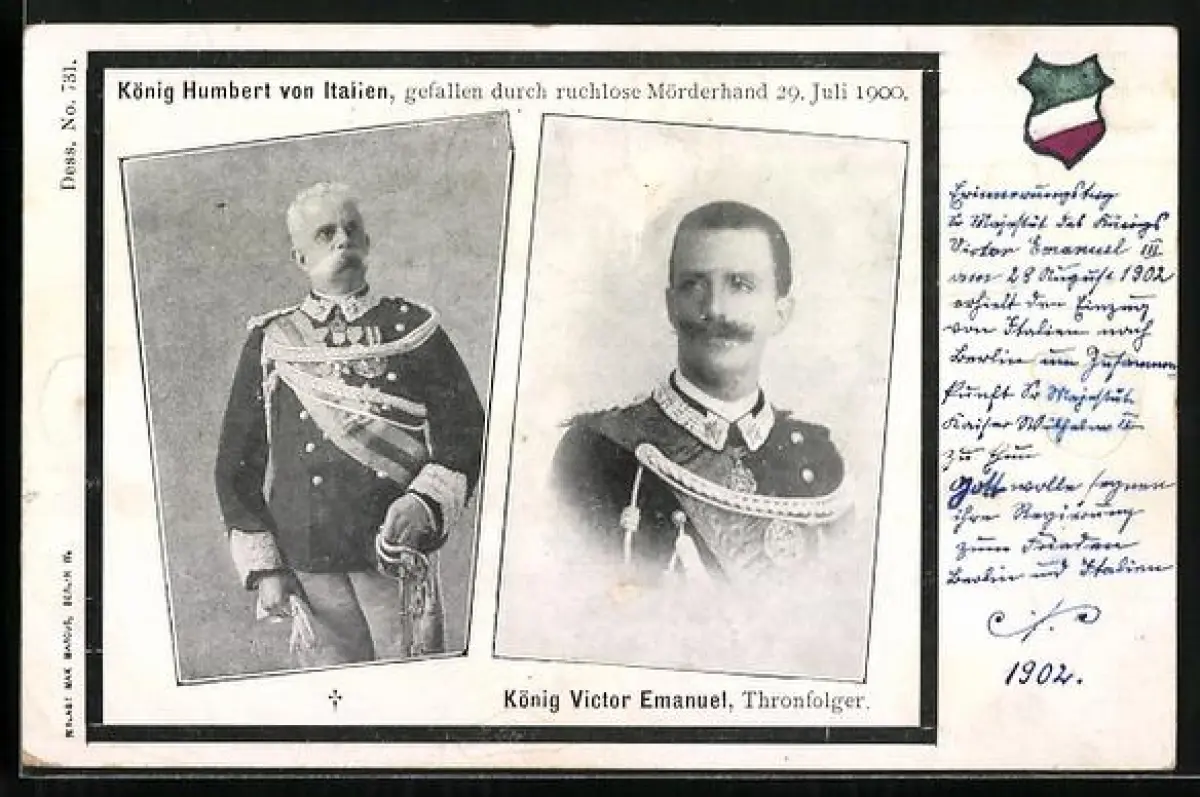 AK König Humbert von Italien, gefallen durch ruchlose Mörderhand und Thronfolger Victor Emanuel