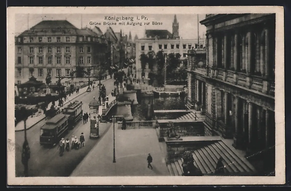 AK Königsberg, Grüne Brücke mit Aufgang zur Börse, Strassenbahn