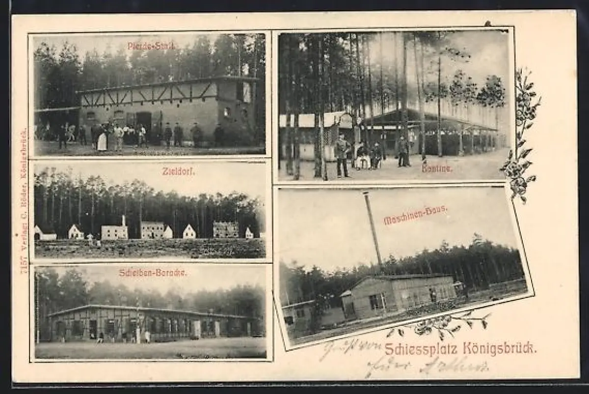 AK Königsbrück i. Sa., auf dem Schiessplatz, der Pferdestall, die Kantine, Zieldorf, Scheiben-Baracke