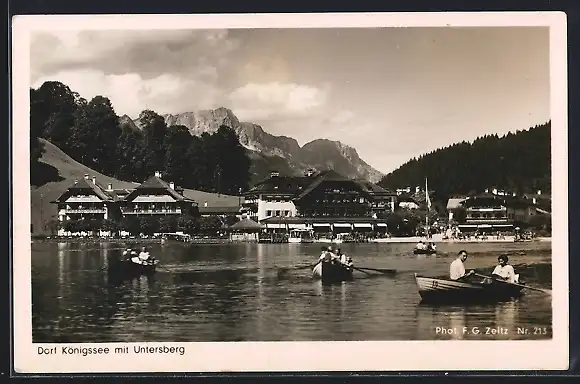 AK Königsee / Berchtesgaden, Boote vor dem Dorf gegen Untersberg