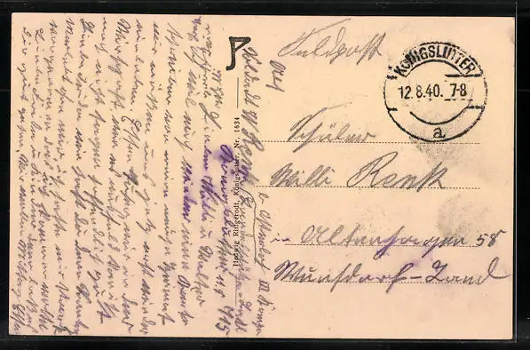 alte Ansichtskarte, gelaufen 1940 als Feldpost, Eckknick re. unten, Stempelspur, guter Zustand