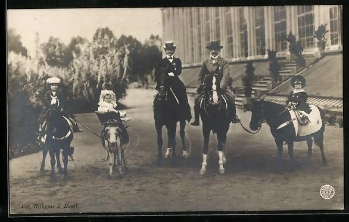 AK Königspaar mit Kindern auf Pferden u. Ponies vor einem Palast