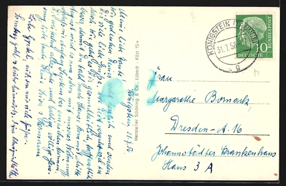 Personenbezogene Daten auf der Rückseite der Karte wurden durch blauen Textmarker unkenntlich gemacht. Die blauen Stellen sind auf die Vorderseite durchgeweicht und wirken sich negativ auf das Postkartenfoto aus