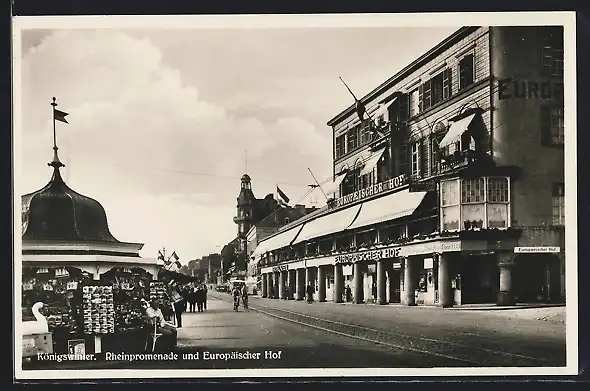 AK Königswinter, AK-Kiosk und Hotel Europäischer Hof an der Rheinpromenade